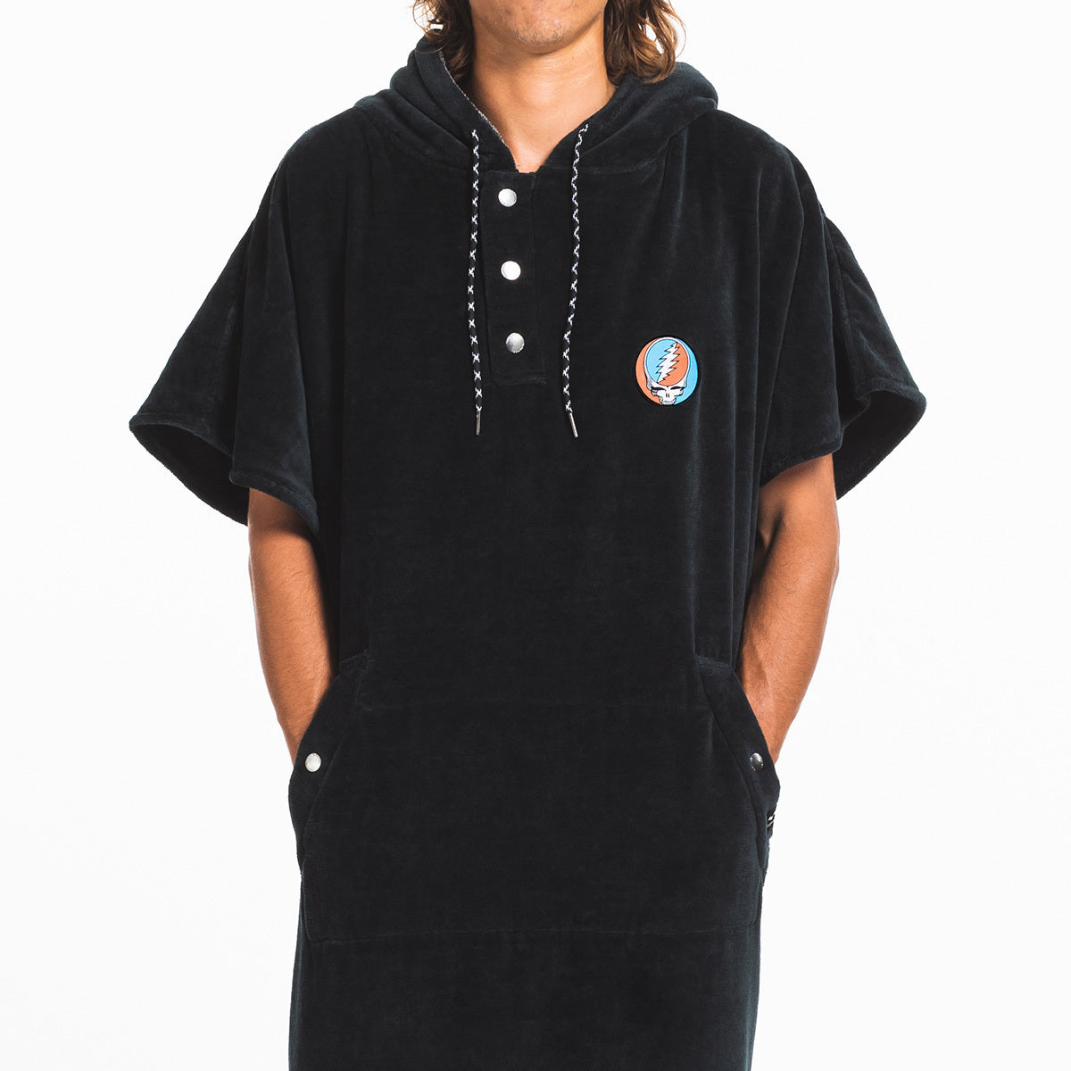 - Snap front placket with drawcords